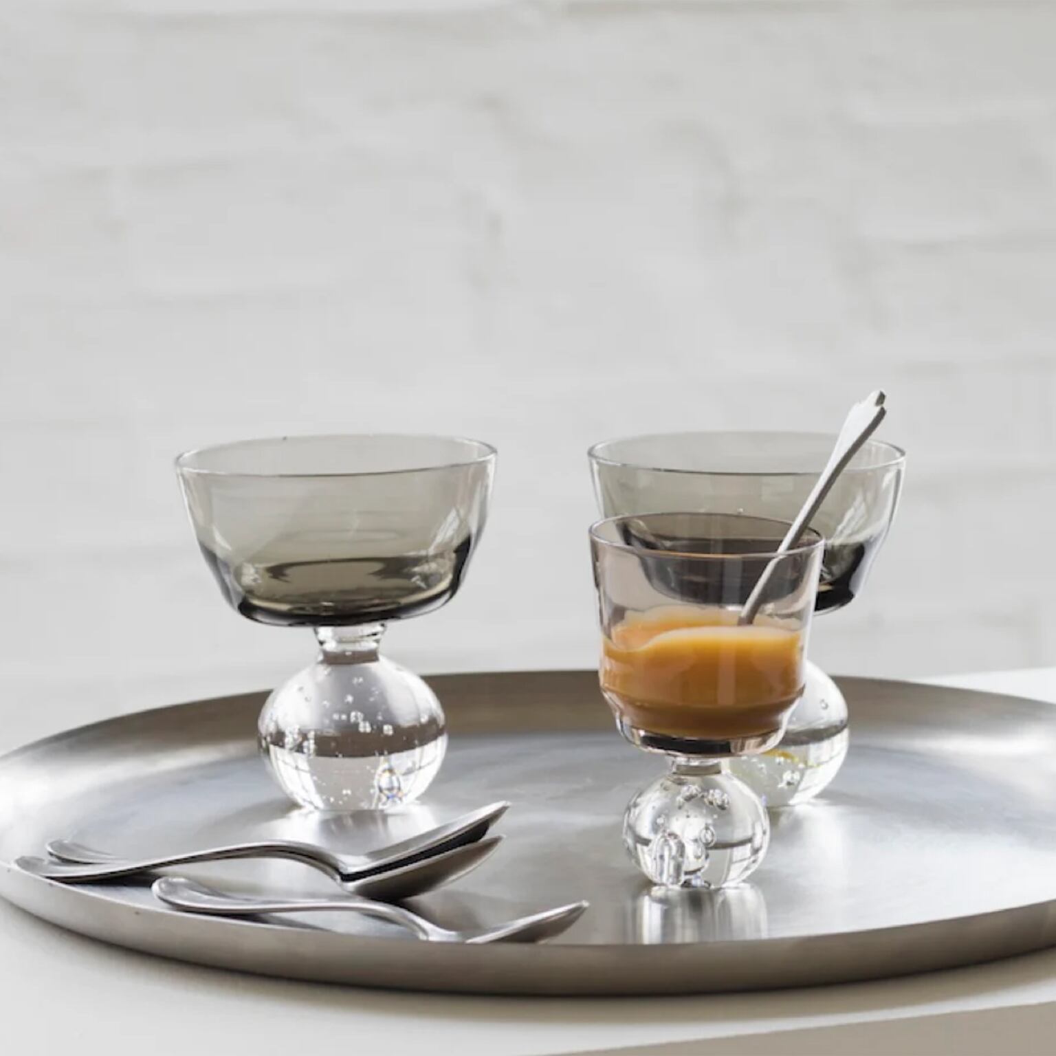 特徴的な丸いフットが魅力のステムグラス。Eternal Snow の滑らかな質感と、型破りな吹きガラスの形状を組み合わせてデザインされました。