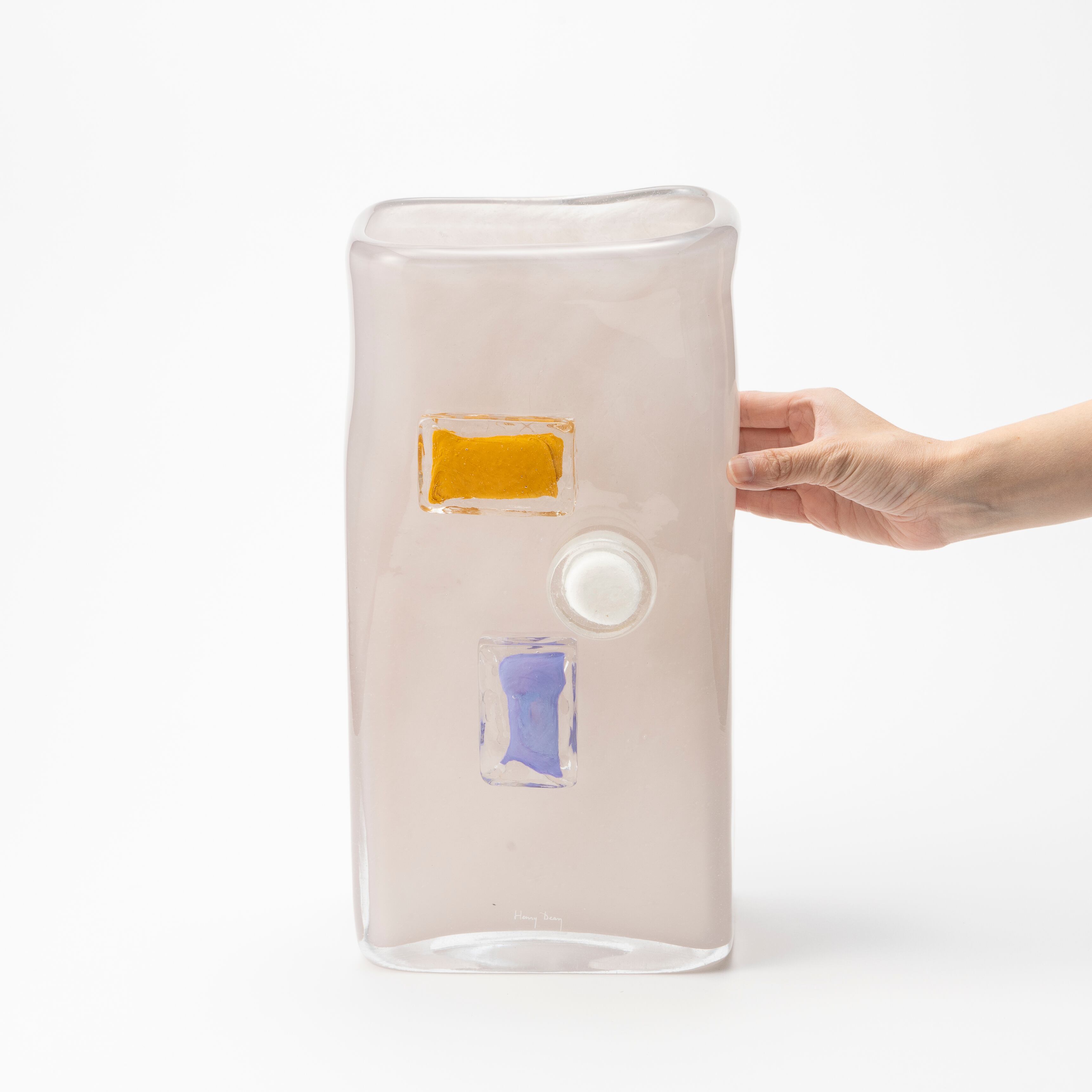 四角いフラワーベースをキャンバスに見立て、そこに長方形や丸い飾りを装飾することで絵画を表現しています。