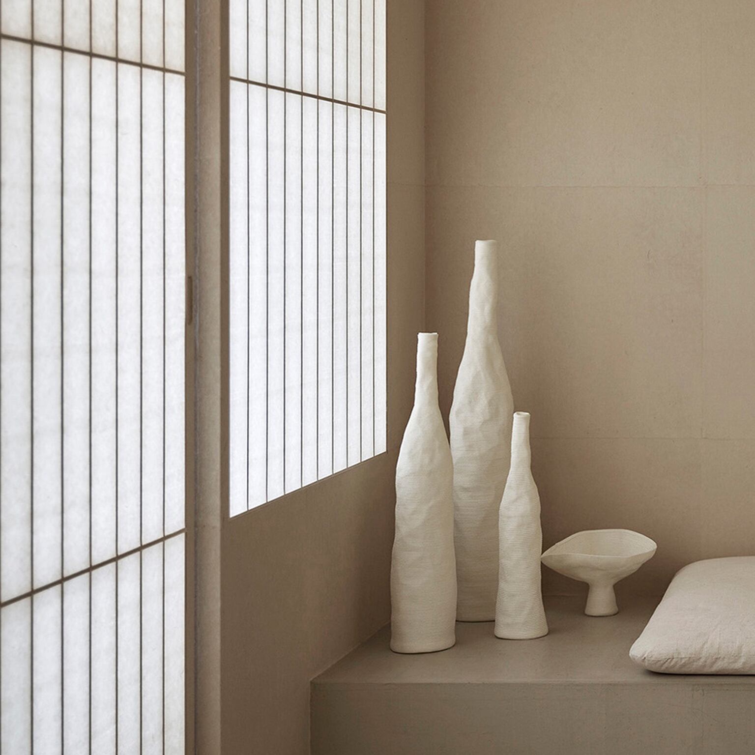 NON FLEUR(ノンフルール)は、自身でシワをつけ、光のあたり方によって優しい表情や彫刻のような力強い表場など、変化を楽しめるインテリアオブジェです。中は空洞になっているため表情がつけやすく、テキスタイル素材ならではの軽さで、壊れることもありません。