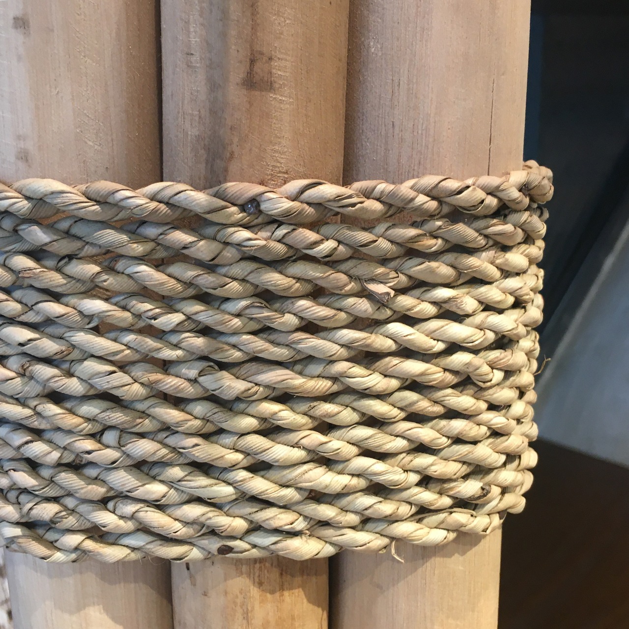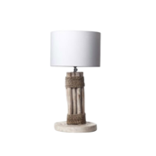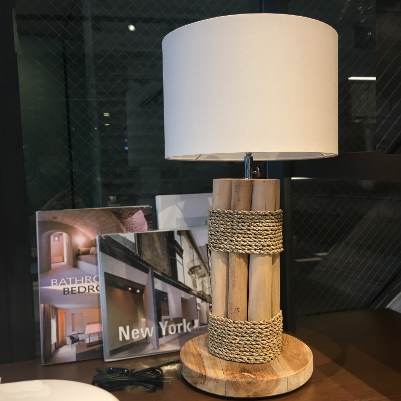 チーク材をロープで束ねたテーブルランプ。モダンなカラーシェードとの対比で、シャープな中にも抜け感あるオブジェの様な照明に仕上がっています。