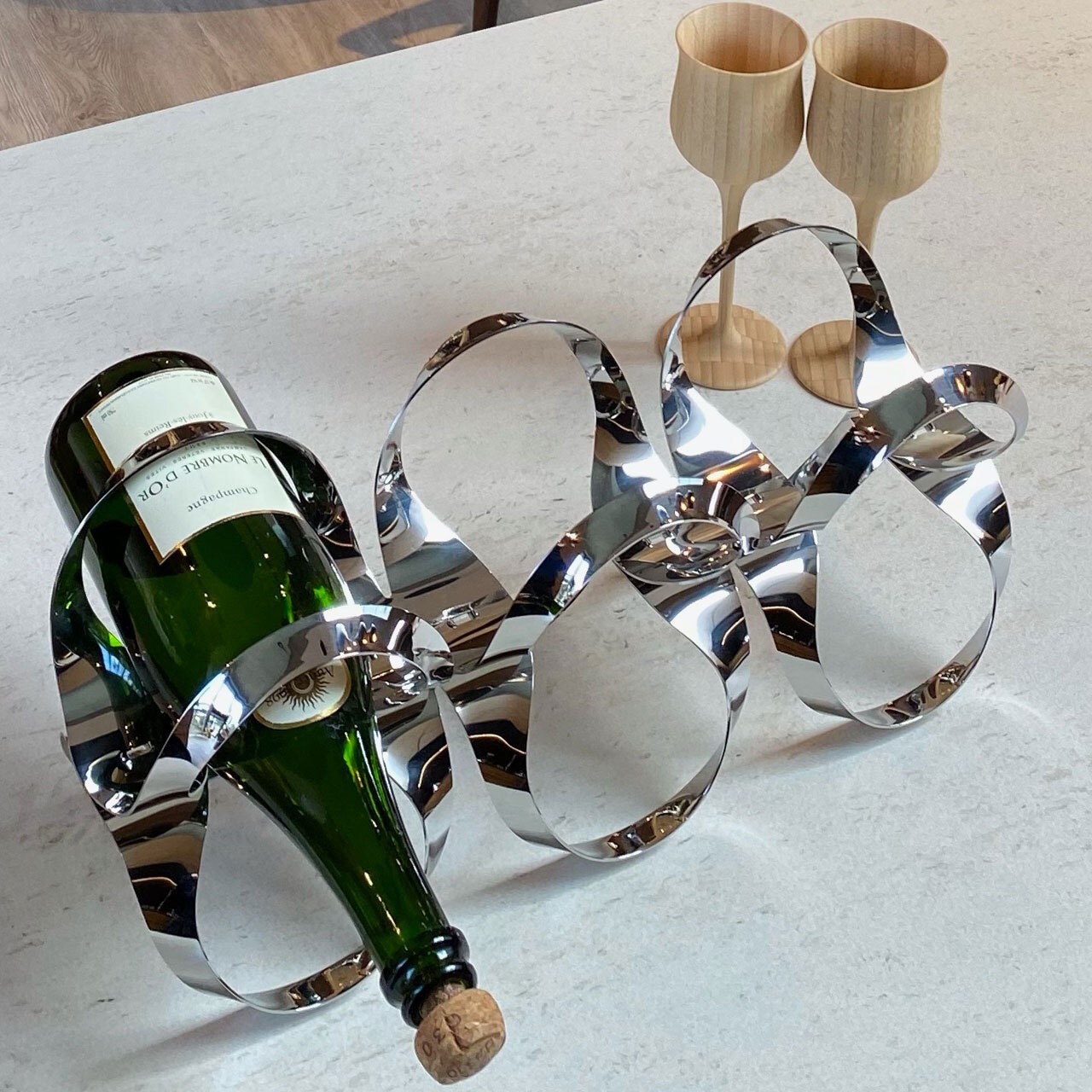 一般的なサイズのボトルを6本、ユニーク且つ繊細に格納することができます。