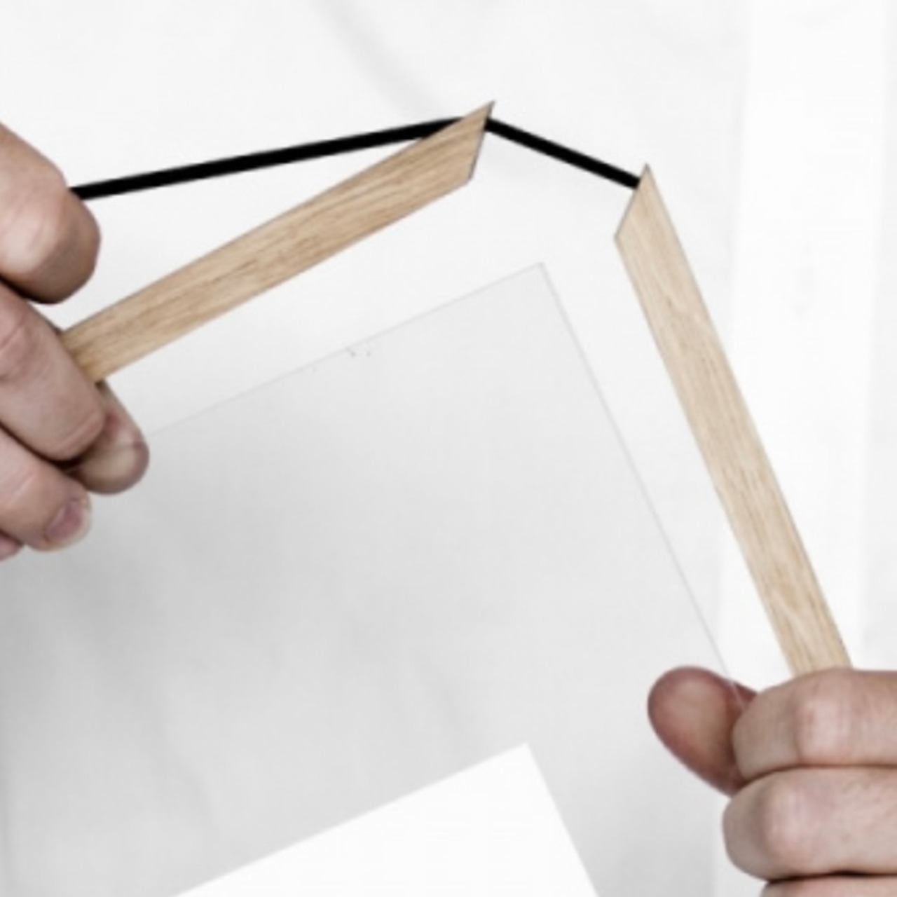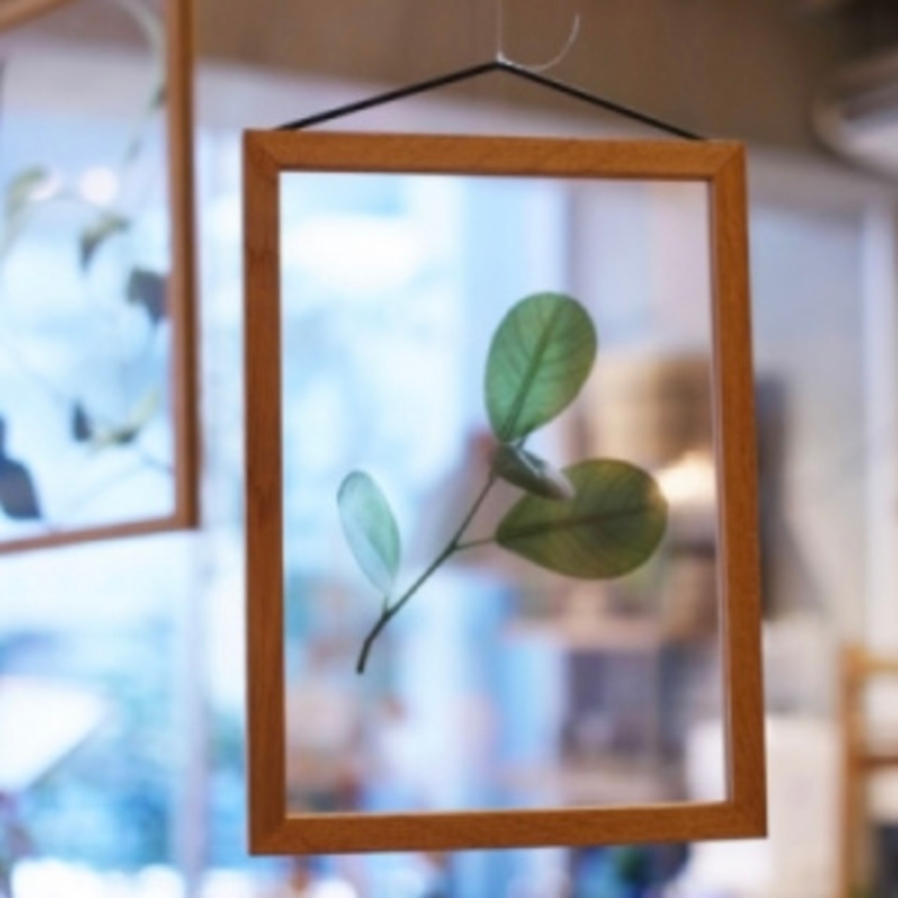 透明なアクリル2枚とアルミのフレーム、それらを固定するラバーバンドのみで構成され、細いフレームと透明なデザインによって生み出される余白が、飾るものを引き立てます。
